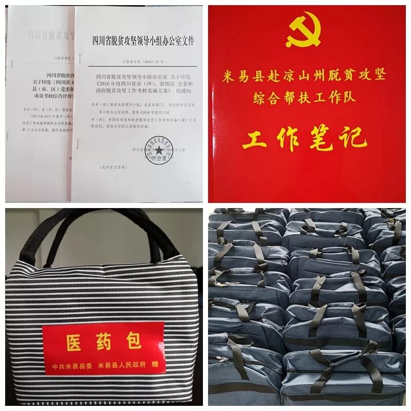 为让帮扶工作队员尽快熟悉政策、进入角色,为每名帮扶队员精心准备了学习袋,配备了脱贫攻坚的相关政策文件、在凉山州日常生活知识手册,专门印制《米易县赴凉山州脱贫攻坚综合帮扶队工作笔记本》,切实为帮扶工作队员提供了学习便利;考虑到帮扶工作队所驻村比较偏远,医药不便,为每名帮扶队员配备医药包,备齐预防感冒、腹泻、外伤等常用药品,将细致入微的关心关怀送到每名帮扶队员的心里。